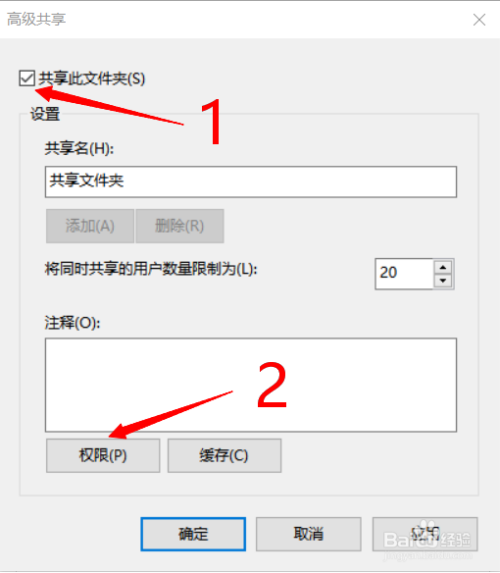 点击‘共享此文件夹’,然后再点击‘权限’。直到来到如图所示界面。