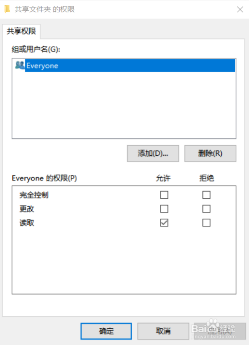 点击‘添加’可以添加新用户,也可以选择此电脑里的其他用户。如果我们使用局域网连接的话,一般就操作当前界面的everyone就行了,此处以everyone为例。点击‘everyone’,然后下面便是其相应的权限,点击方框自由选择即可。