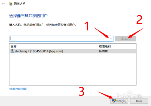 鼠标左键下拉可以选择用户,然后点击‘添加’,可以将用户添加,然后点击‘ 共享’即可修改成功。最后点击‘确认’即可。