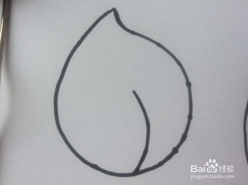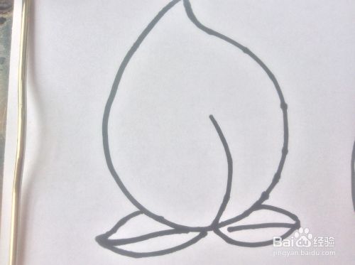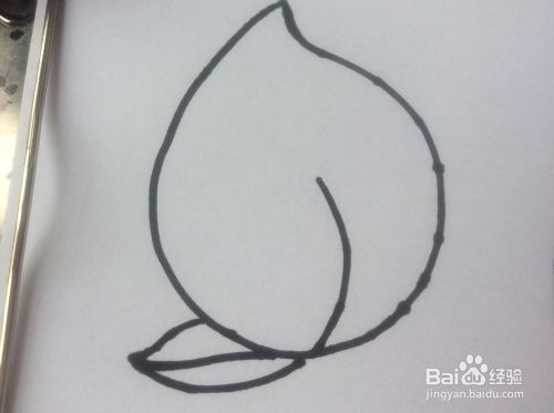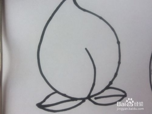 在水蜜桃轮廓线下方的左侧,画出水蜜桃左侧的叶子。在叶子的中间位置画出叶脉。
