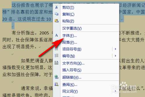 右键选择需要调整行距的内容,右键单击鼠标,选择字体。