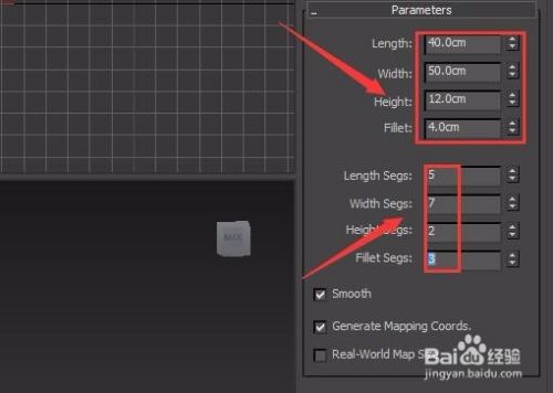 选择刚刚创建的chamferbox物体,在modify里修改参数如图所示: