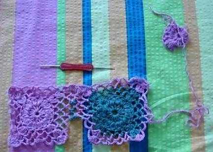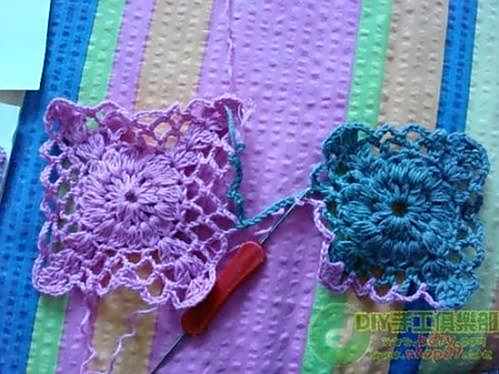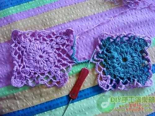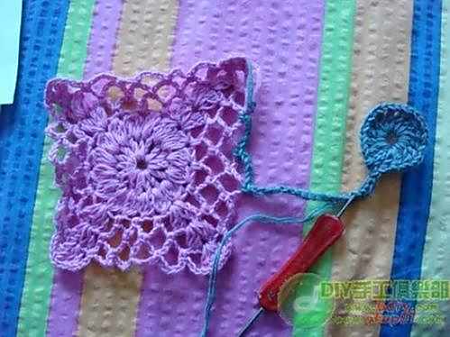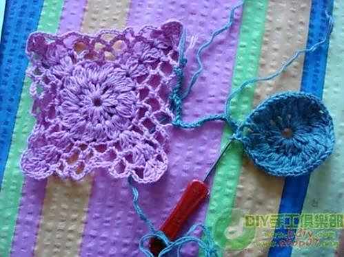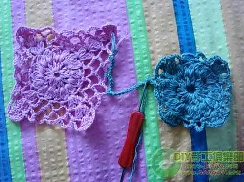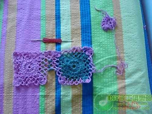 1首先我们先把第一个花钩出来,按照单元花的钩法钩,当最后一圈里,我们把解上的爹冷小草花钩出后,在钩三个小辫,然后在下面国侮的网上用短针接,然后在钩五小辫形成的网二个,总计三个网,从这里