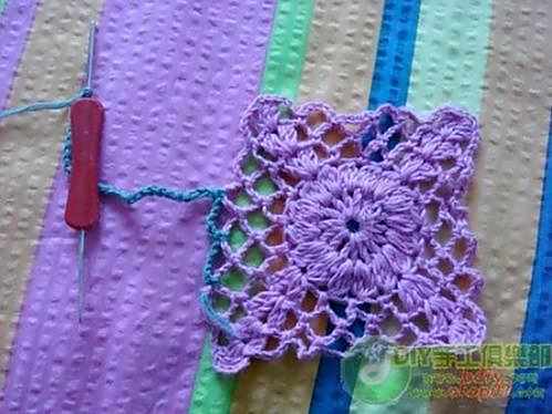 5用最后那一圈,对接,二个小辫到第一个花上去与网相用短针接,然后在二个小辫回来,就这样循环,到角上小草花时二个长针一个小辫,与第一个花小角引跋针引过来在一个小辫二个长针,然后三个小辫在下面短针相接END