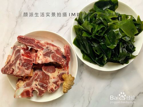 准备材料,解冻后洗牛脊柱,切嫩海带和生姜