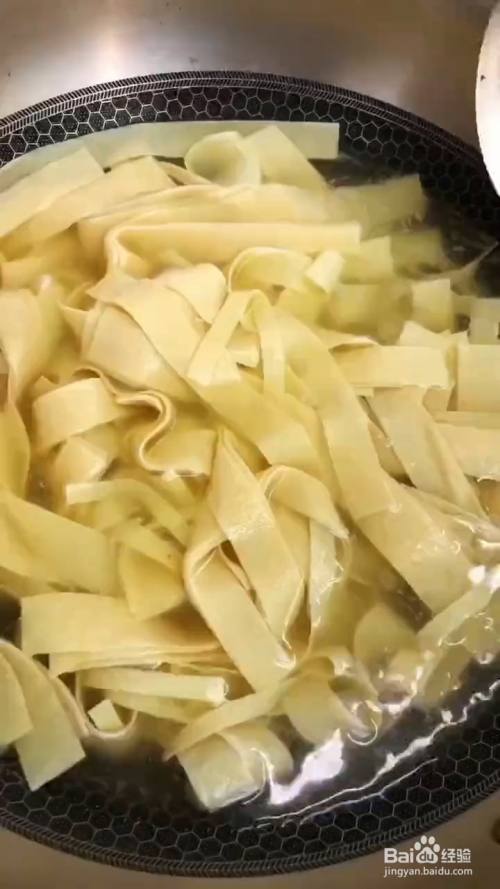 首先将干豆腐皮切成细条,锅中水开,下入干豆腐皮和食用面碱烫一会儿,然后捞出备用。