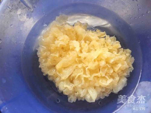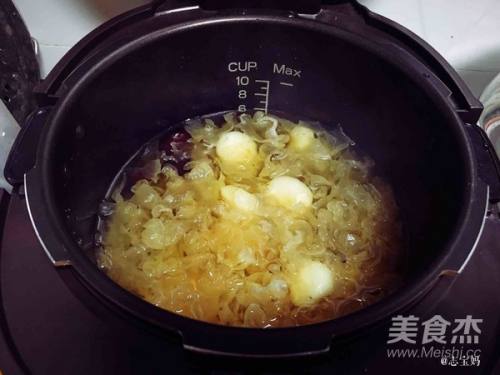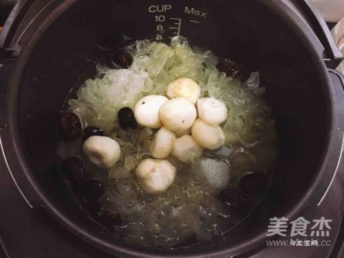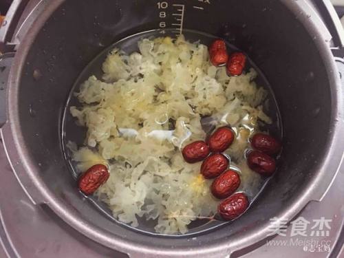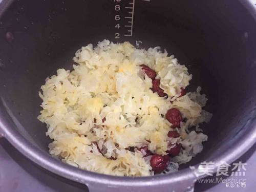 4泡发好的银耳剪碎放进电压力锅,洗净的红枣也一起加入到锅里。