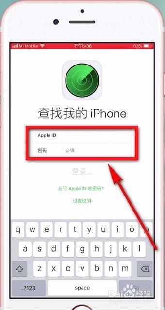 首先打开手机自带应用【查找iPhone】,然后输入要定位的苹果手机的iCloud账号密码。