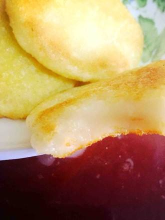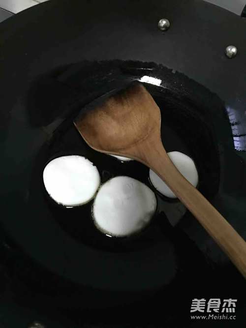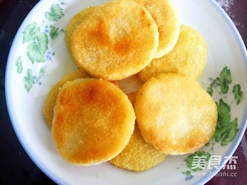 3搓成球后,让它晾至几分钟,蒸发一点水分,再次搓球压扁入锅时,如果面不易成型,可以在手心用一点点水湿一下再搓就搞定了。锅底热油关火,糯米饼全部放入锅内再开中火,表面变色就好了。很快。