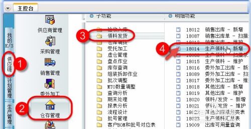 操作员登录ERP主控台,依次展开【供应链】->【仓存管理】->【领料发货】->双击打开【生产领料单-新增】。