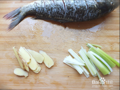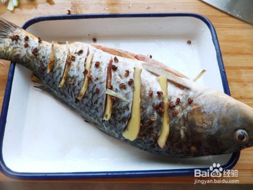 在与肚子里放入几片姜片,鱼身上也放入几片。