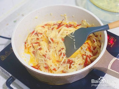 锅内放入菜籽油,烧热,将辣椒丝放进去爆炒出红油来