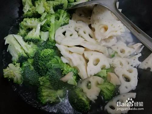 将锅里倒入适量的水,水里加点盐,大火烧开,然后将西兰花和莲藕片一起倒进水里。