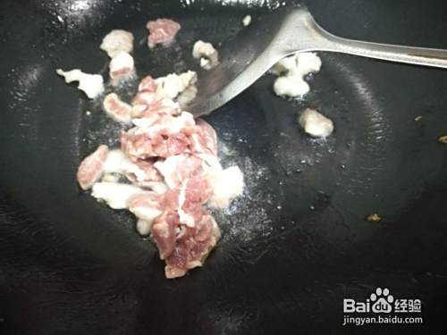 接下来开始预热锅底,倒入适量的油(由于西兰花比较吸油,所以要多点),将肉片放进去,姜蒜放进去一起翻炒。