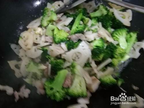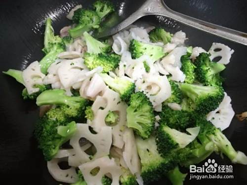 再将烫好的西兰花和莲藕片一起放进去翻炒均匀,加入适量的食盐,几滴酱油,搅拌均匀。