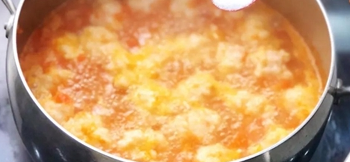 加入植物油预热出油纹后,倒入番茄炒出水;