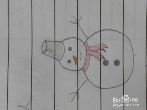 在雪人的两边,我们插上两个枝干。雪人的两个手就完成了。我们选择彩色铅笔给雪人上色。祝大家圣诞节快乐哟。记得点赞。