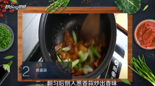 2翻炒后,倒入葱姜蒜炒出香味,加一勺料酒、两勺生抽、半勺老抽,翻炒均匀。