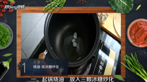1起锅烧油,放入三颗冰糖炒化,倒入五花肉翻炒。