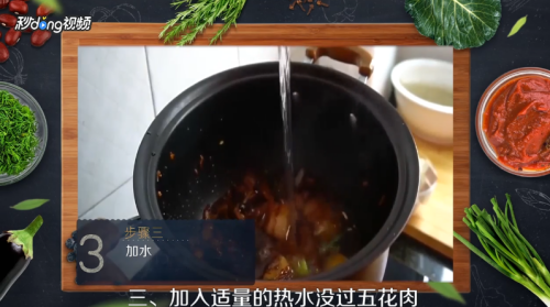 3加入适量的热水没过五花肉,放入两个八角、三个辣椒。