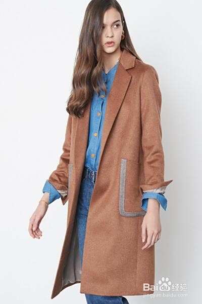 咖啡色大衣搭配蓝色牛仔裤穿着,撞色明显,时尚又大方。