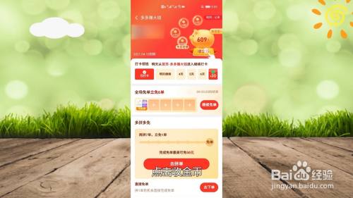 点击主页的多多赚大钱,连续点击两次收金币,点击去收更多金币,选择可领取即可。