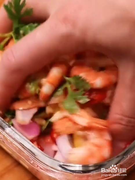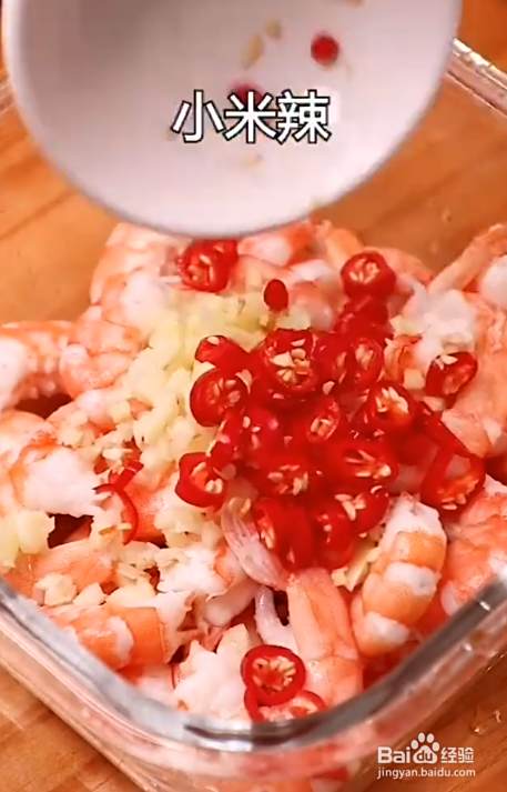剥掉虾壳,放姜蒜末,小米辣,盐,糖等调料。
