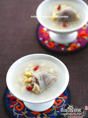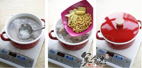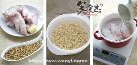 黄豆洗净,用清水浸泡1夜。将浸泡黄豆的水倒掉,再次清洗黄豆,沥干水分备用将猪蹄剁开,用清水洗净。把猪蹄放入锅中,一次性倒入清水,大火煮开后撇去浮沫姜去皮切片,和黄豆一起倒入锅中,盖上盖子,炖煮3个小时。食用前调入盐即可,盛出后放几颗洗净的枸杞