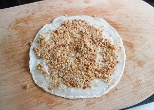 煎饼很快就做好。这时候把馅料撒在饼上。