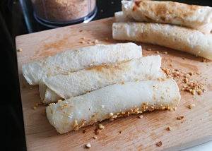 面糊放一边,准备馅料。茶楼里卖的甜薄撑的馅料是以花生为主,加入椰丝、烤芝麻和糖。自己在家做则不用太拘泥,可以做得更好吃,我这里用的馅料有椰子味鱼皮花生、核桃、肉桂夏威夷果、肉松、烤芝麻、椰丝、金砂糖。