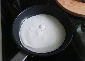 来做煎饼。我用不粘锅煎油可以用少一点。热锅倒油,用厨房纸把油抹均匀,倒入面糊,转锅把面糊摊圆摊薄,保持中大火,大约半分钟看到表面定型则可以翻面。