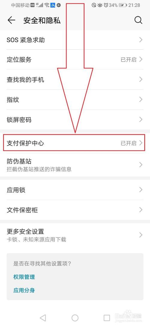 继续,我们在安全和隐私页面即可看到支付保护中心点击进入。