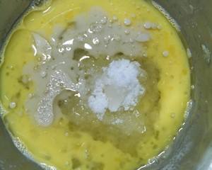 鸡蛋打散,留一点刷饼干上色。然后蛋液里加入糖,玉米油和温水化开的酵母,搅拌均匀。