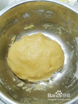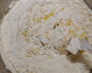 在加入面粉和无铝泡打粉,用翻拌的手法翻拌成团。