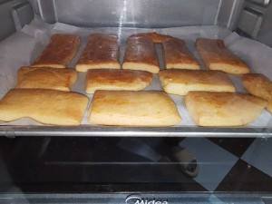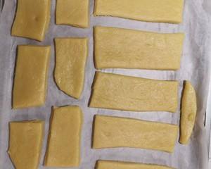 这时候烤箱预热,150度。醒发好的面团,擀成1-2厘米厚的饼,然后切成想要的形状,烤盘铺好油纸,摆盘,薄薄的刷一层蛋液。