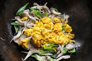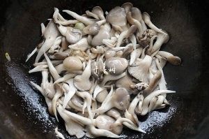 锅内重新放油,烧热爆香葱蒜,下入平菇翻炒,刚开始平菇还是比较硬的。
