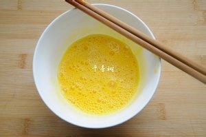 鸡蛋打入碗中,用筷子搅散开来,最好能多搅拌会儿,搅到蛋液表面有一层细密的小泡泡,这样在炒的时候鸡蛋会变得体积又大又软和。