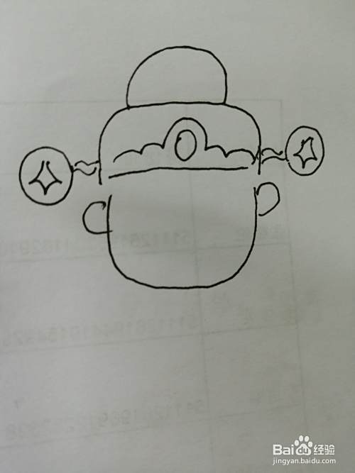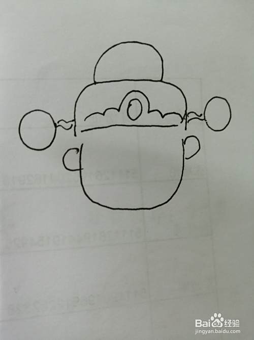 第三步,然后画出简笔画财神爷的圆圆的脸和两只大耳朵。