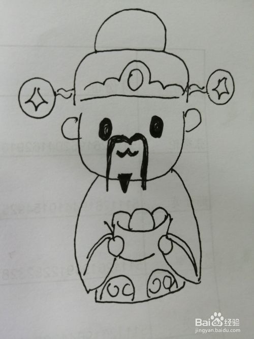 第八步,最后把简笔画财神爷的两只腿画出来。可爱的简笔画财神爷就画好了。