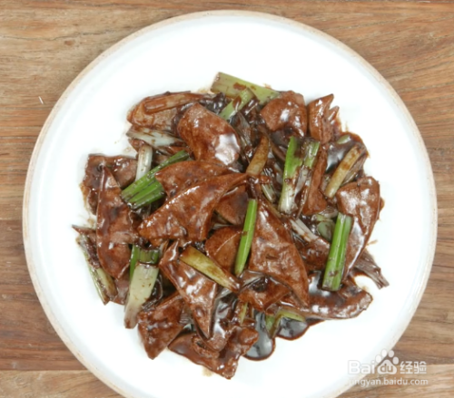 6、锅中炒出香味后,加入老抽5毫升、酱油10毫升、白糖3克,大火烧开,倒入少许水淀粉勾芡。下入焯过水的猪肝,大火快速翻炒至猪肝全部裹上酱汁,就可以装盘出锅了,这样一道既好吃又下饭的酱爆猪肝就做好了,小伙伴们学会了吗。