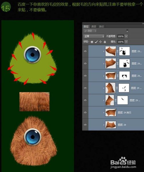 选择画笔工具,画出怪物的全身还有手,然后用涂抹工具,强度设置为80%,把涂色的图层往外抹,根据实际毛发方向涂抹。
