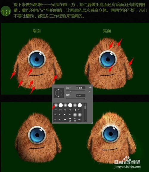 接下来做光影,光是在前上方,我们要做出亮面,还有暗面,还有脸部眼睛,嘴巴的凹凸产生的明暗,让画面的层次感变立体。