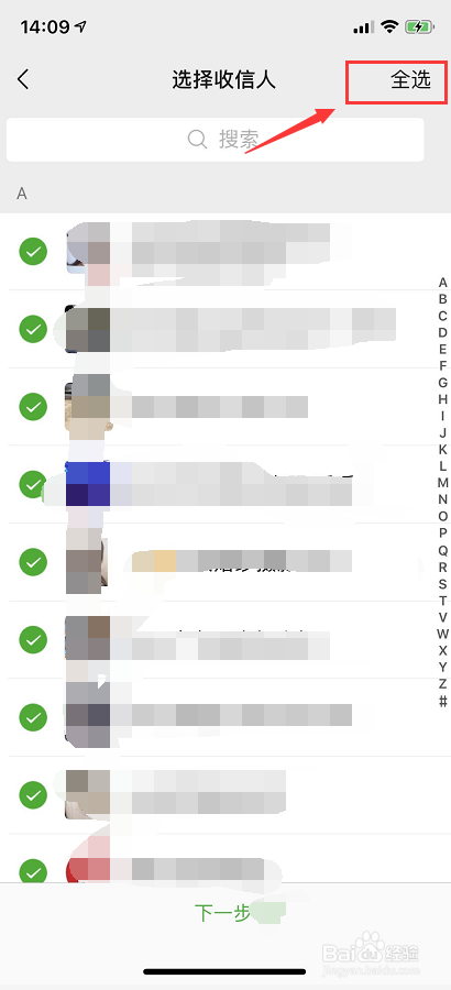 选择【全选】(提示:联系人不超过200人的情况下,如果超了,按批群发),然后点【下一步】
