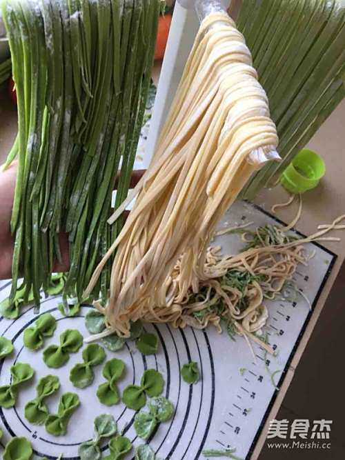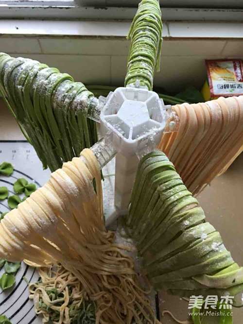 2取少许盐均加入三份面粉中,将菜汁一点一点的倒入面粉中,边倒边感觉面粉的软硬,面团要尽量硬点,为了保证后面的擀面