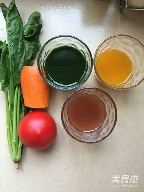 1菠菜和一个西红柿是用刀切的很碎,放到碗里用刀把一直砸,后用纱布袋包起来把汁捏出来,一次搞不干净汁,就反反复复,红萝卜是先切的很薄,放进开水锅中煮,直到很烂,出来切碎碎,同上用沙布袋[呲牙][呲牙]