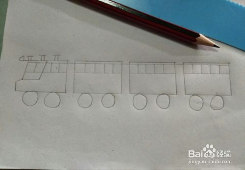 第三步:在车头的后面再画出三个车厢,如下图所示