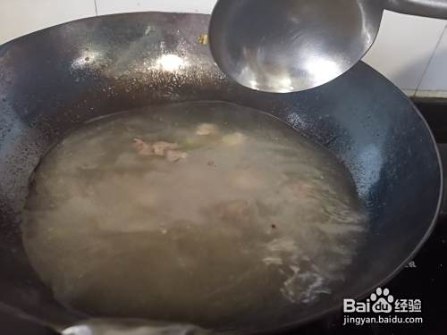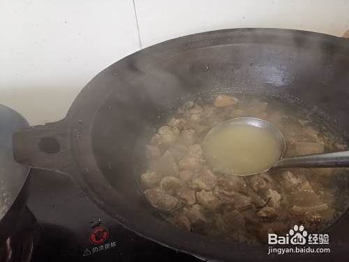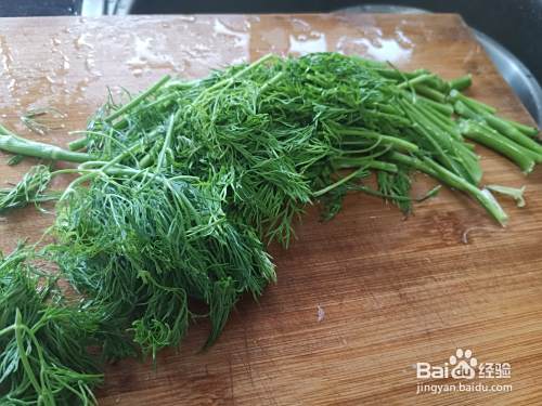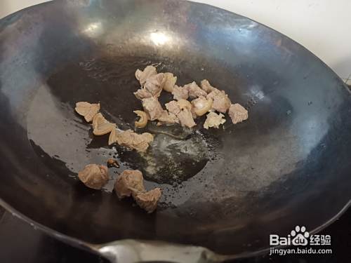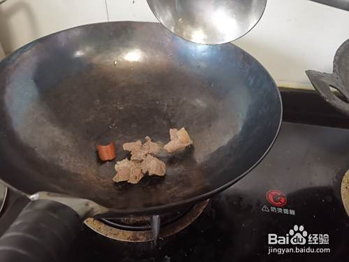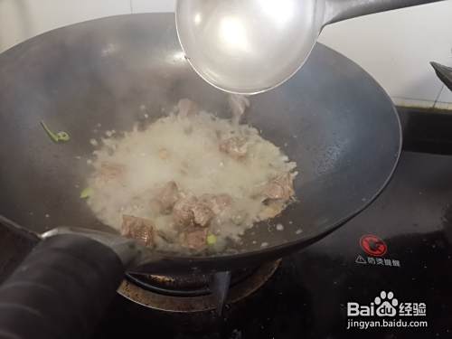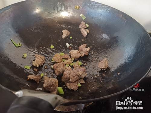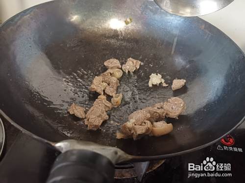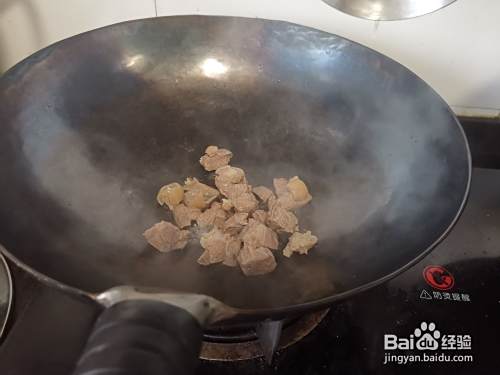 茴香洗净后切断待用,羊肉切块下锅炒香