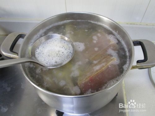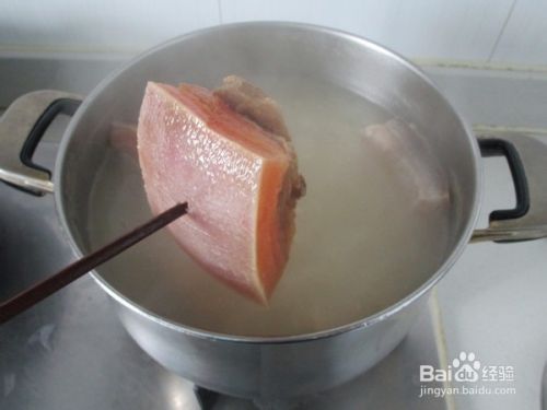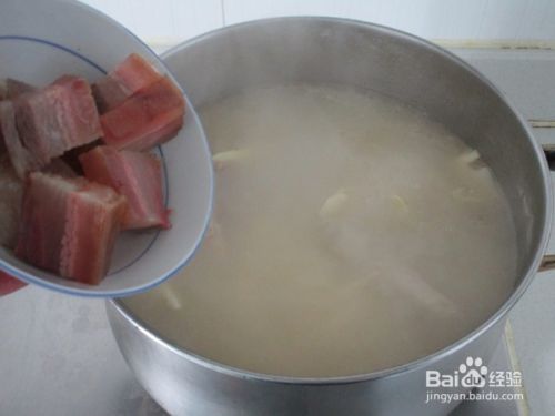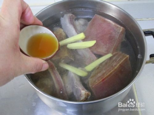 之后把猪尾骨和咸肉一起入锅,注入清水,加入生姜和黄酒盖上大火烧