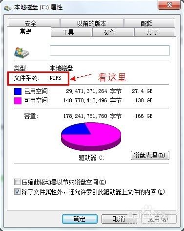 Windows系统中,通过在C盘上点击右键打开“属性”项,在“本地磁盘”对话框中,可以看到C盘使用的文件系统格式。