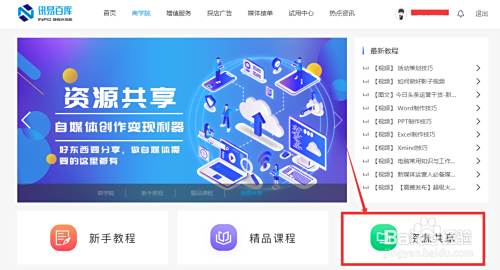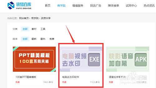 进入网站后,点击上方的“商学院”,再点击“资源共享”,如图;